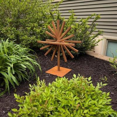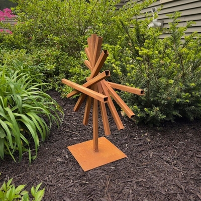Fabriquée à la main en soudant plusieurs tubes de sculpture en acier de jardin patinés, cette pièce accrocheuse présente un design dynamique inspiré d'un moulin à vent.