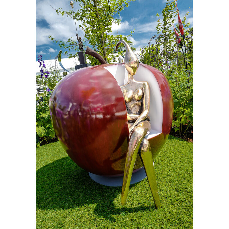 Cette figurine en édition limitée représente une femme gracieuse,en cuivre massif coulé avec une patine finie à la main, assise sur l'emblématique Apple Chair, réinventée ici en rouge vif, revêtu de poudre sur un cadre en acier inoxydable.