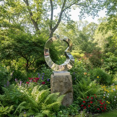 Cette sculpture contemporaine présente une forme fluide et abstraite fabriquée à partir d'acier inoxydable poli de haute qualité.ce qui en fait un point focal frappant pour tout jardin, la pelouse, ou le paysage.